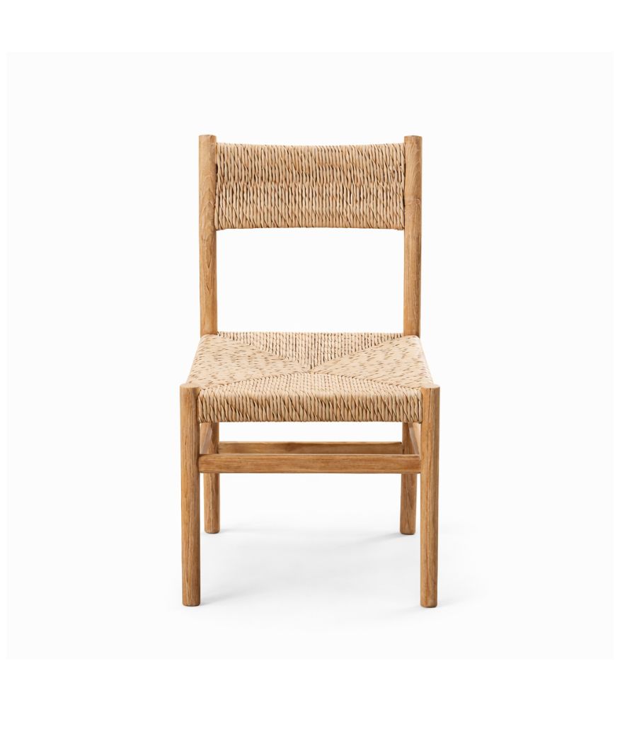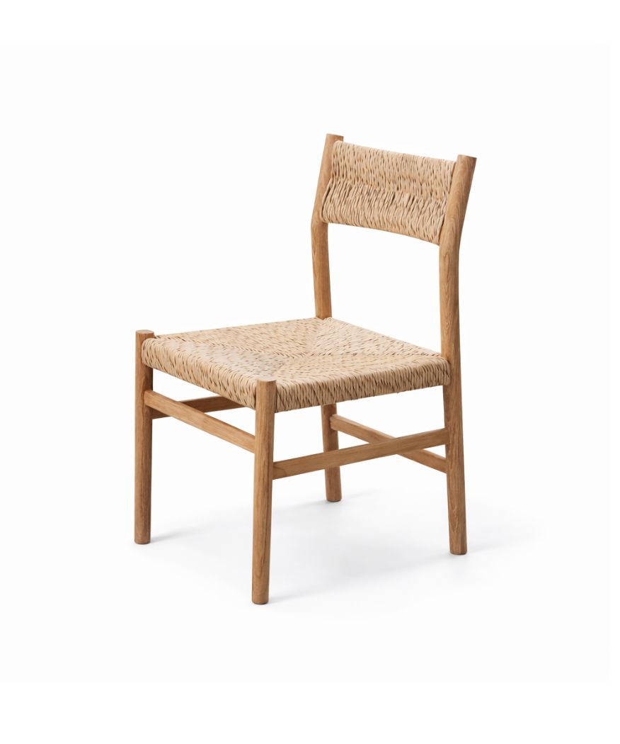 Crafted from solid teak wood with a beautifully woven synthetic twisted hyacinth seat, this chair brings warmth and texture to any dining space.