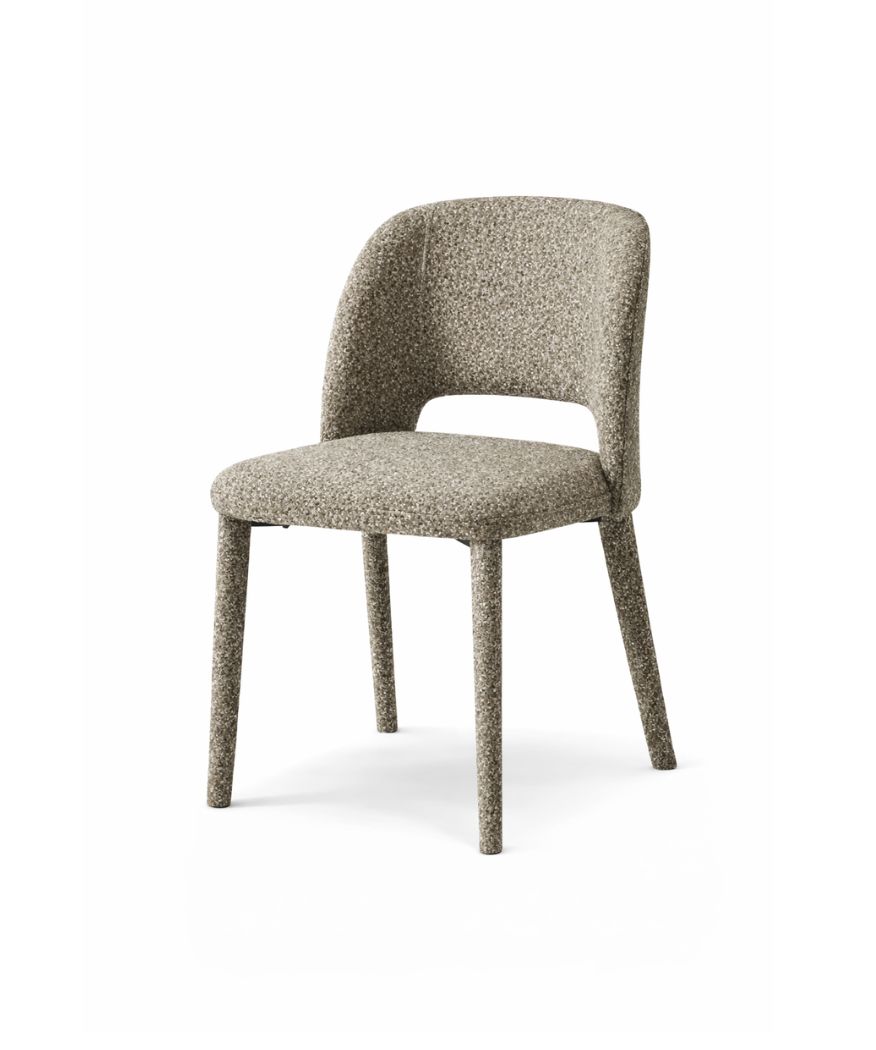 Fully upholstered in textured fabric, it offers comfortable support for everyday dining.