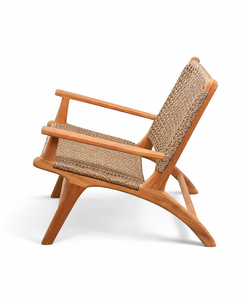 The combination of solid teak wood and woven synthetic twisted hyacinth creates a warm, natural look.