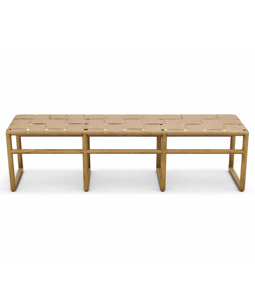 Its long, minimalist form offers comfortable seating while showcasing natural materials and texture.