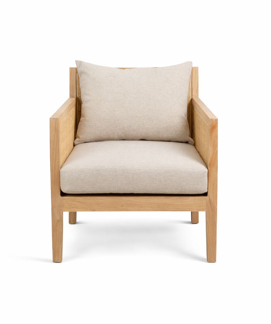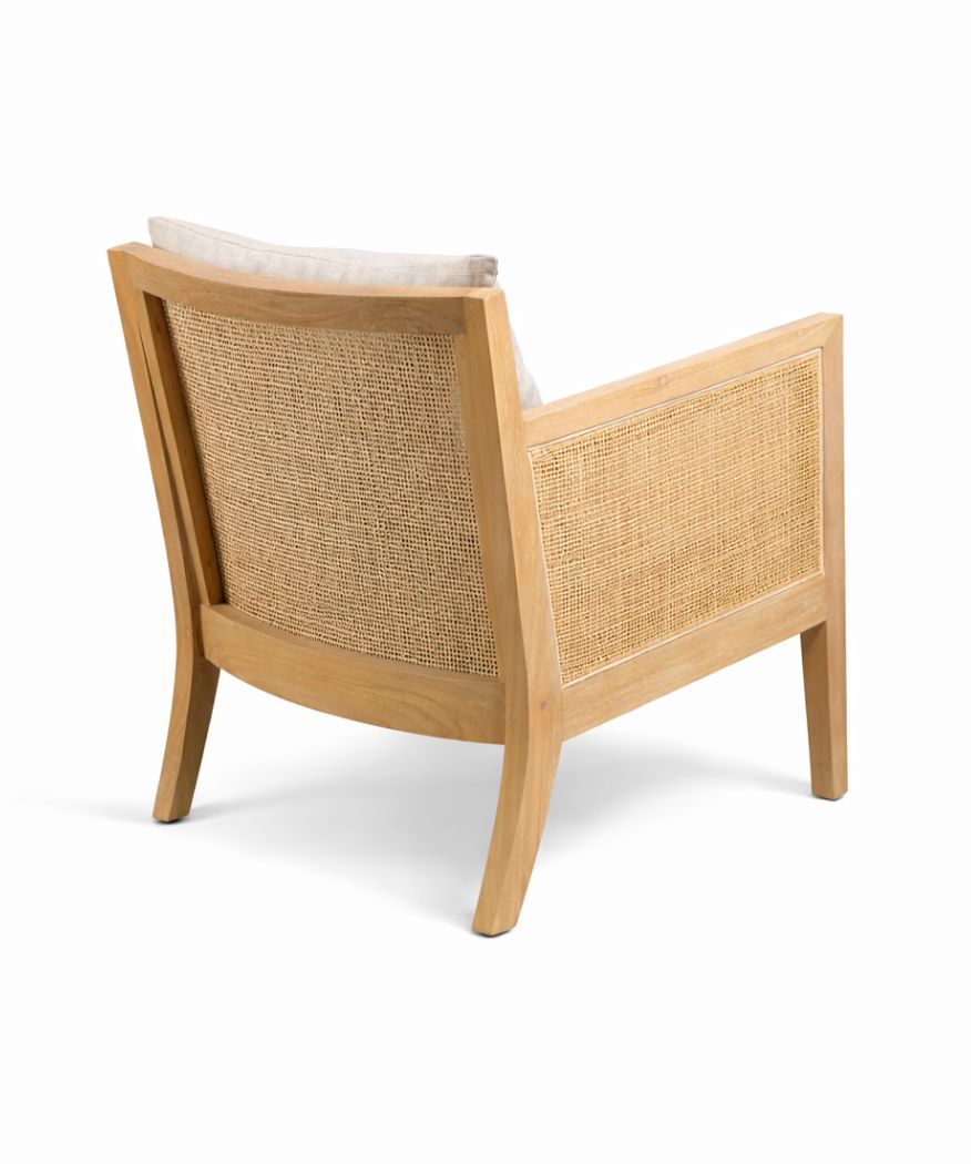 Crafted from solid teak wood, this chair features warm natural tones with beautifully woven rattan backrests and seat.